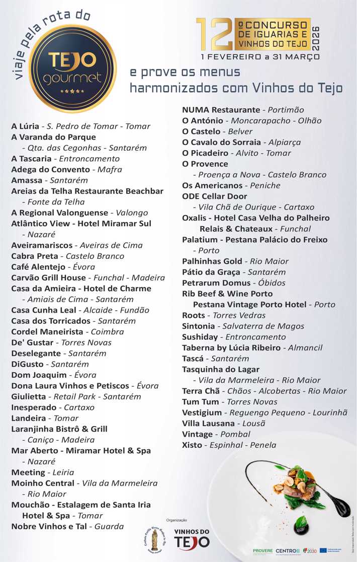 Está já a decorrer aquela que é a 12.ª edição do Tejo Gourmet, um evento gastronómico original pela sua dupla vertente. É um concurso, no qual chefes e responsáveis de vinhos são desafiados a criarem menus originais e em que a harmonização é feita com Vinhos do Tejo, e é, em simultâneo, um convite e um espaço aberto à degustação por parte do público em geral. Com periocidade bienal, este ano são 56 os restaurantes aderentes, tendo as suas criações disponíveis na carta até 31 de março.